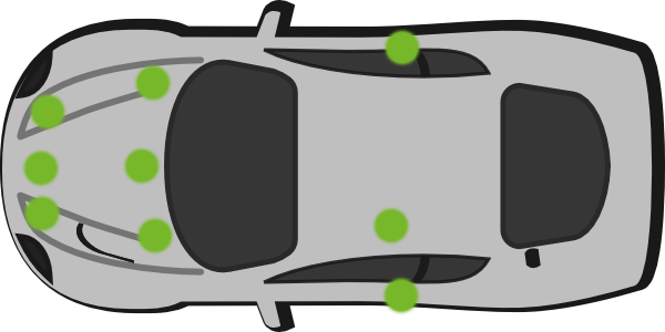 Här får du hjälp att hitta färgkoden på Jeep. Gröna prickarna på bilden markerar var du oftast hittar färgkoden på en Jeep. Du kan sedan beställa bättringsfärg till din bil.