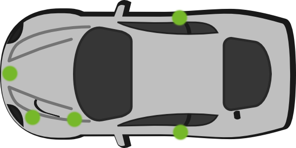 Här får du hjälp att hitta färgkoden på Mercedes. Gröna prickarna på bilden markerar var du oftast hittar färgkoden på en Mercedes. Du kan sedan beställa bättringsfärg till din bil.
